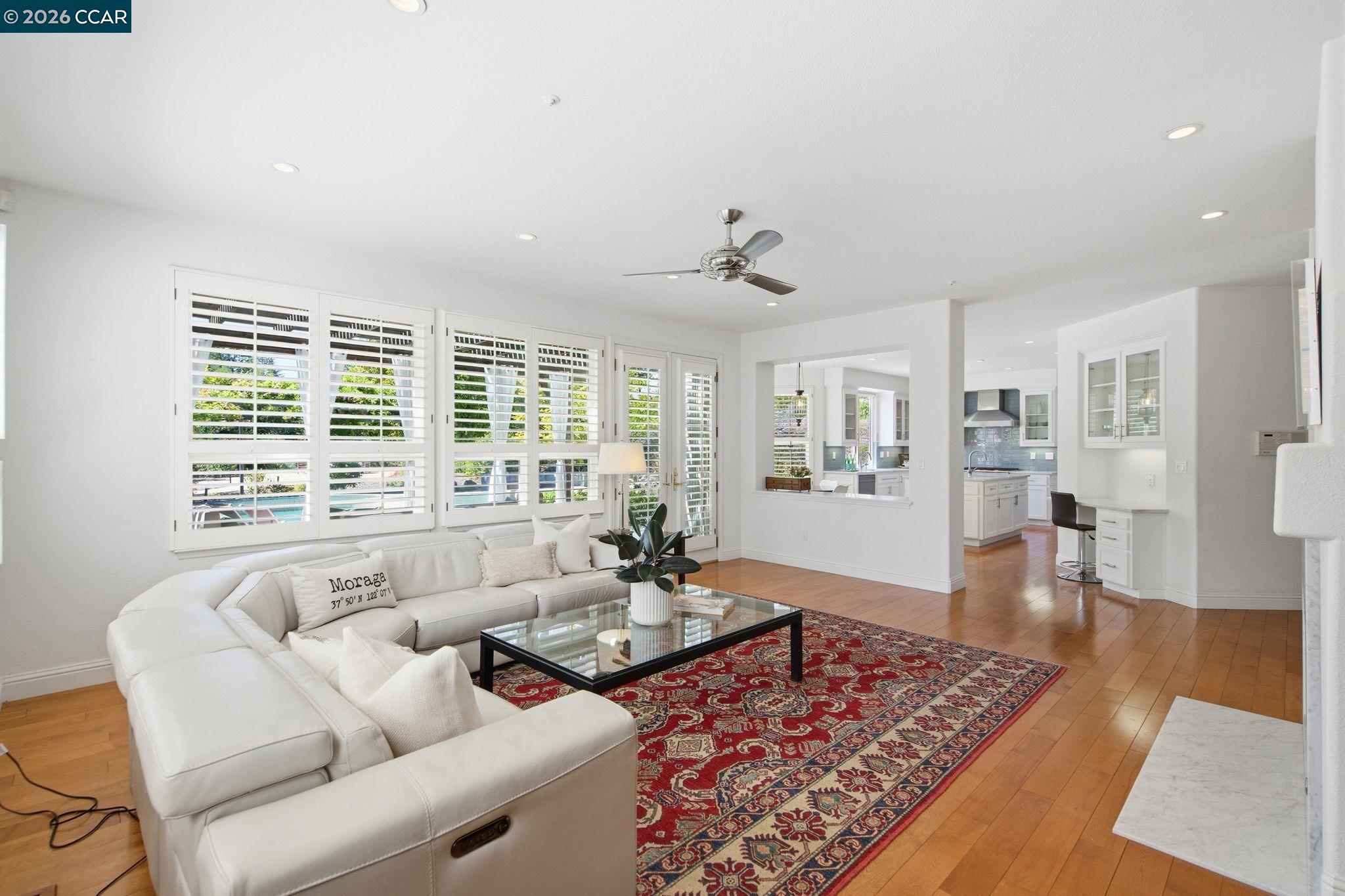 Gorgeous Moraga home located just a few minutes from Rancho Laguna Park. Soaring ceilings, walls of glass, lots of natural light, hardwood floors, generous size rooms and amazing flow. Striking living room with a high ceiling, gas fireplace and adjacent dining room with access to the backyard. Remodeled kitchen with white cabinetry, stone countertops, glass tile backsplash and high-end appliances. The spacious family room is adjacent to the kitchen. There are a bedroom suite and an office on the main level. The primary suite boasts a recently remodeled bathroom, large walk-in closet and a view of the pool & gardens. There is a fantastic bonus room on the second level of the residence that is currently set up as a home theater with projection TV. The backyard features a pool, patios, deck, sports court and lovely gardens. Welcome to Moraga, a highly desirable community with top rated public schools, hiking & biking trails, abundance of open space & Sunday Farmers Market.