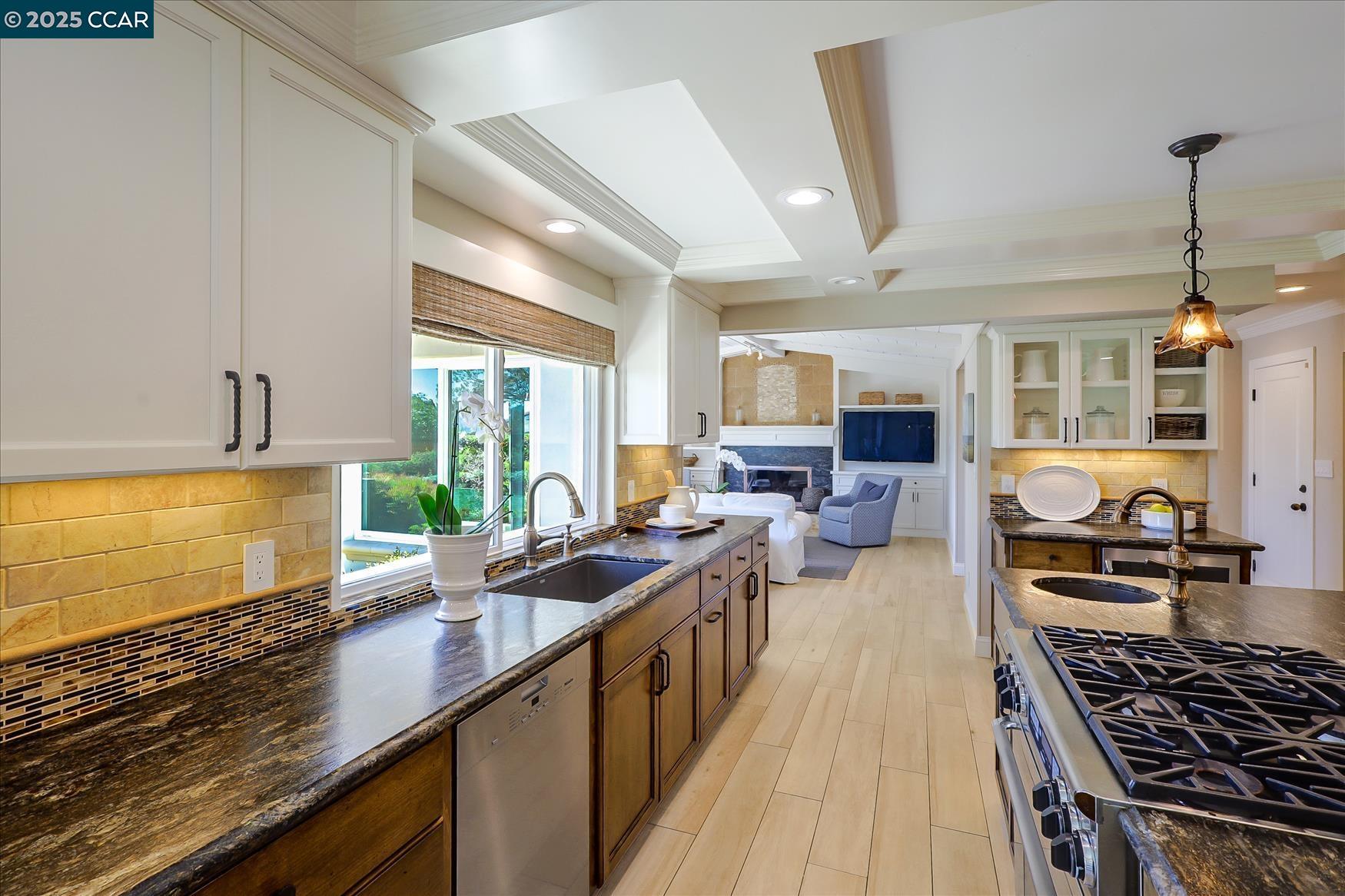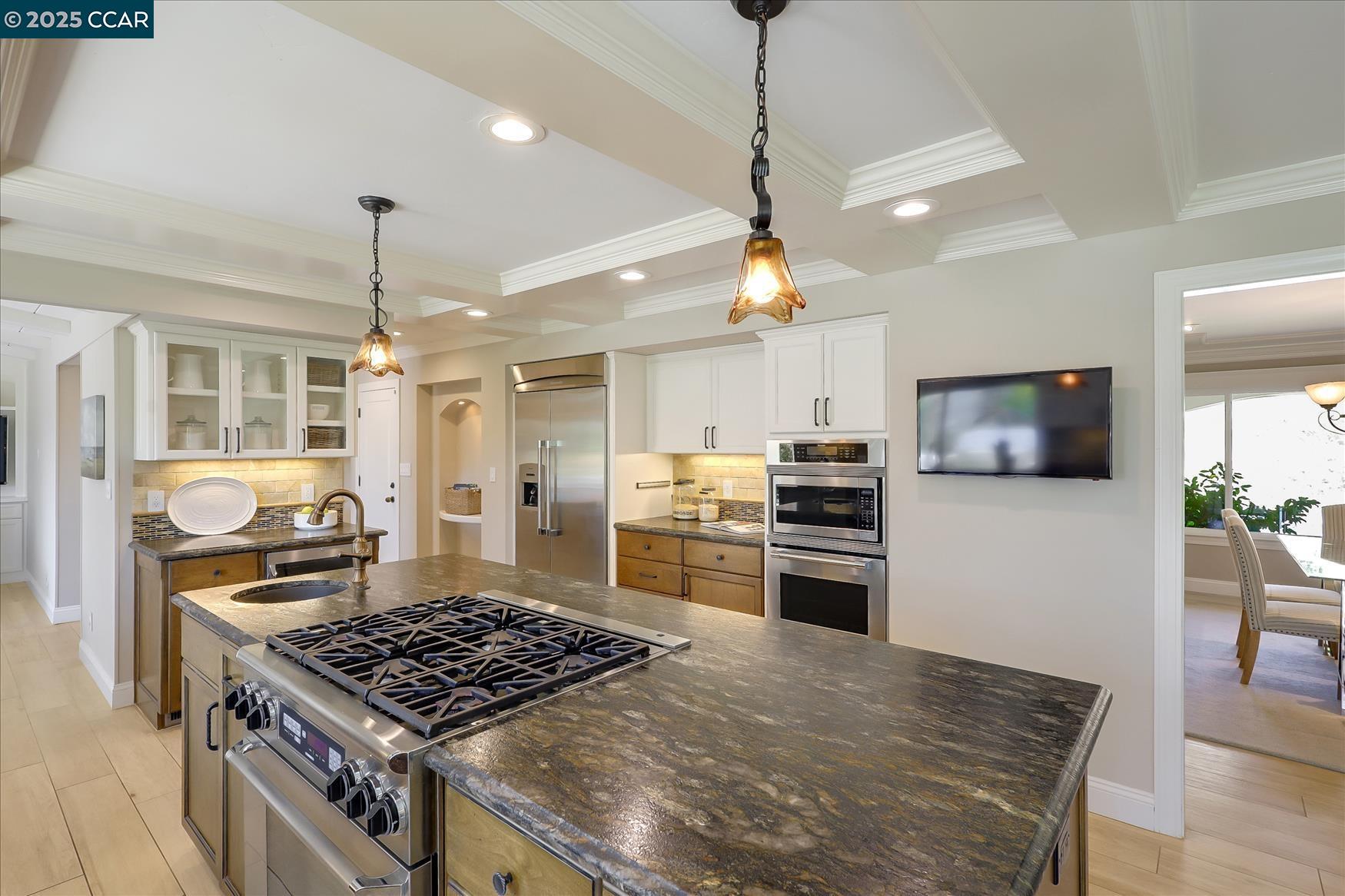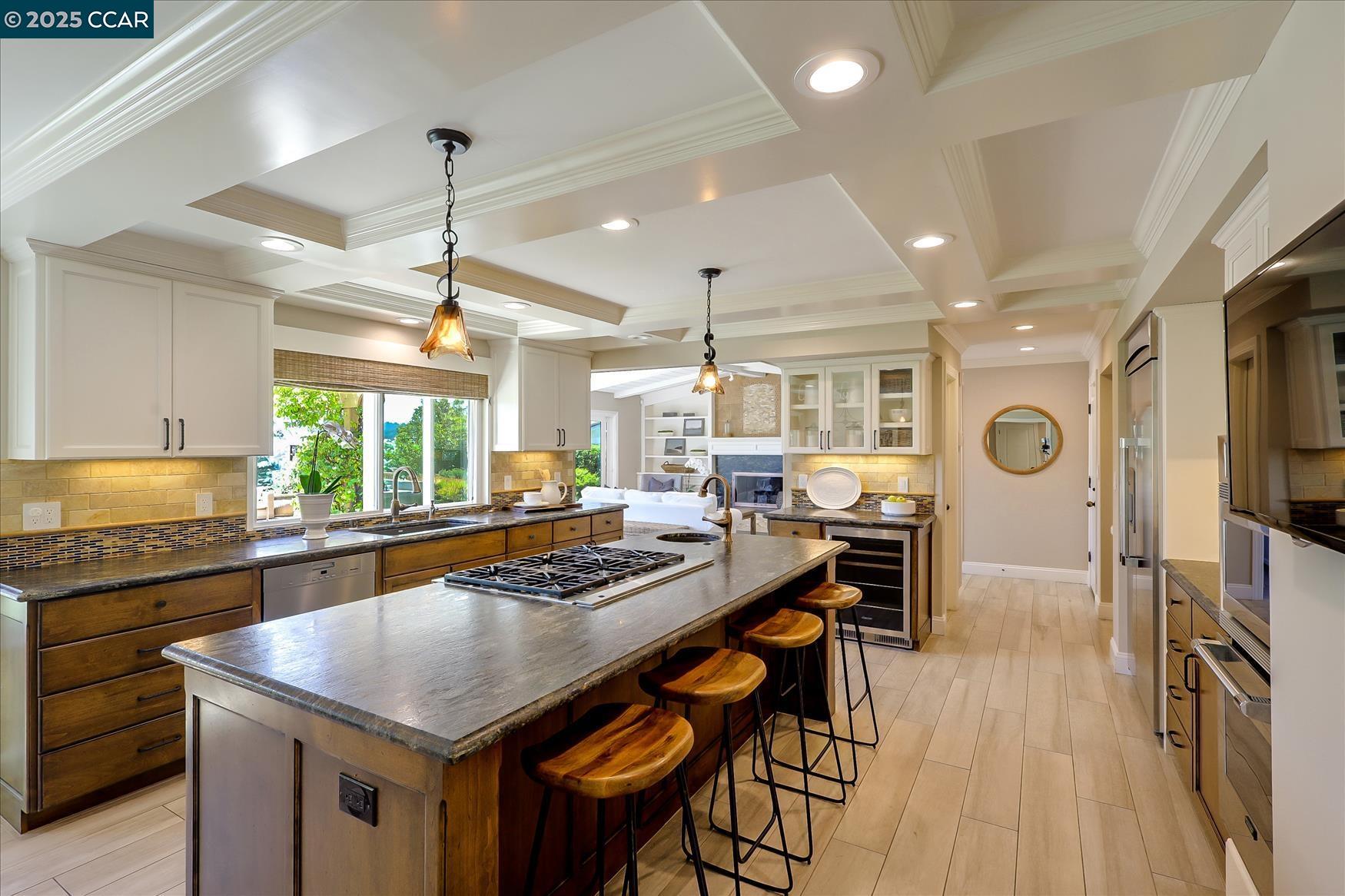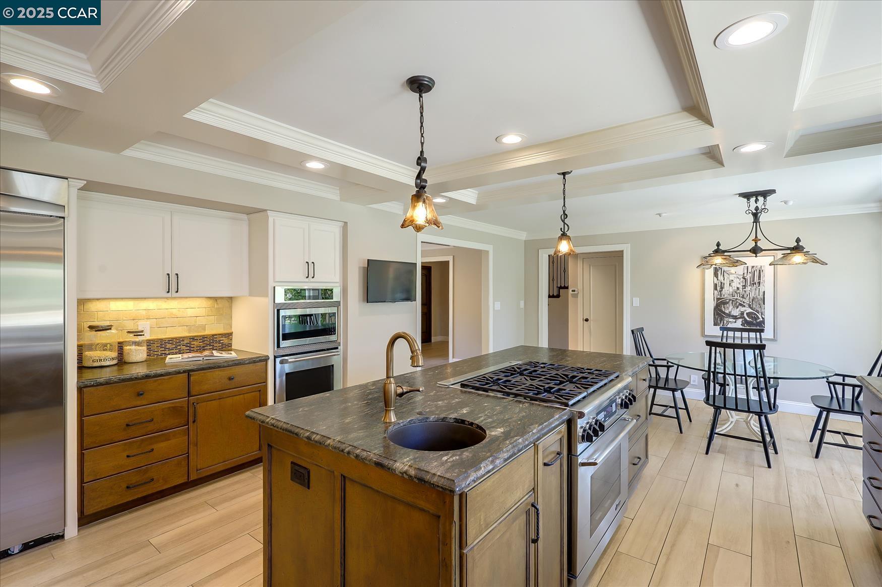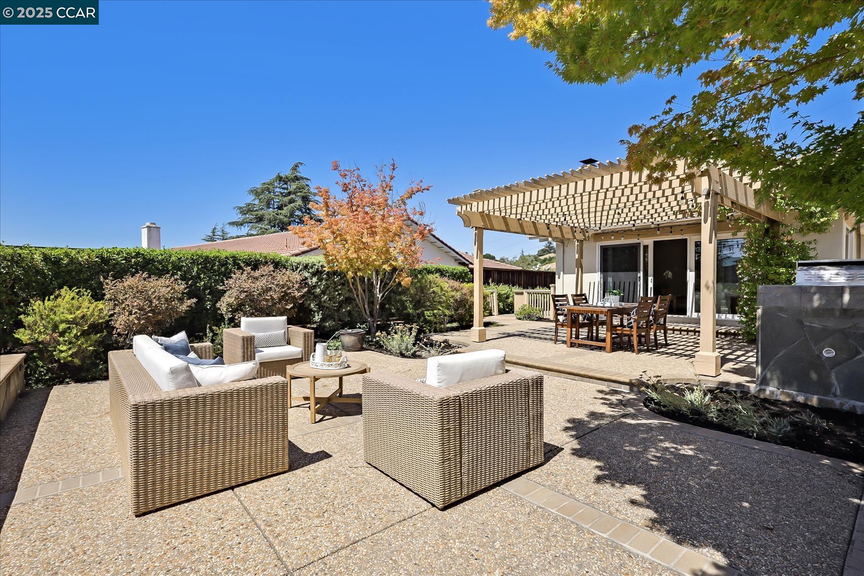 Fantastic home with great views at a highly desirable location, close to downtown and commute routes. Wonderful floorplan with porcelain tile floors, dual zone heating & air conditioning, bedroom and full bath on the main level, 3 car garage and solar. The remodeled Chef's kitchen features a large central island, stone countertops, custom cabinets, high-end appliances and a breakfast area. The generous family room is adjacent to the kitchen and provides a direct access to the backyard. The backyard features a built-in kitchen, lawn, gardens and amazing views. Top rated Moraga public schools. Apply with RentSpree https://apply.link/3dYuDok