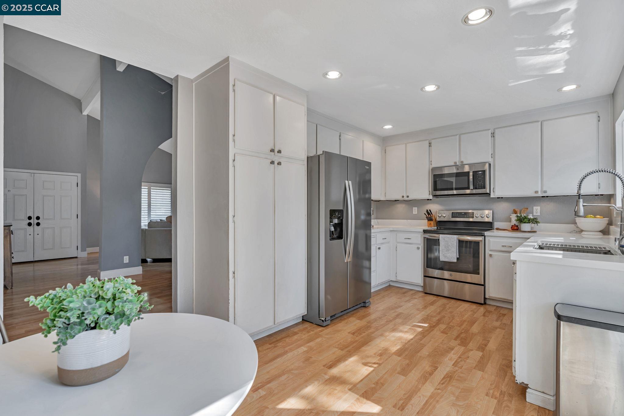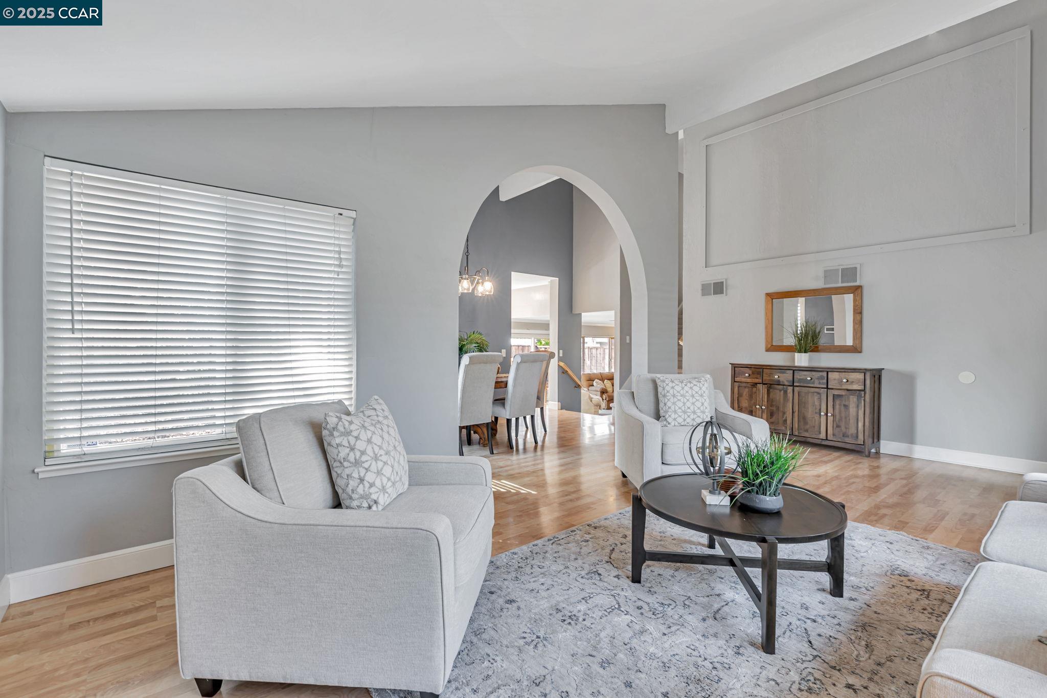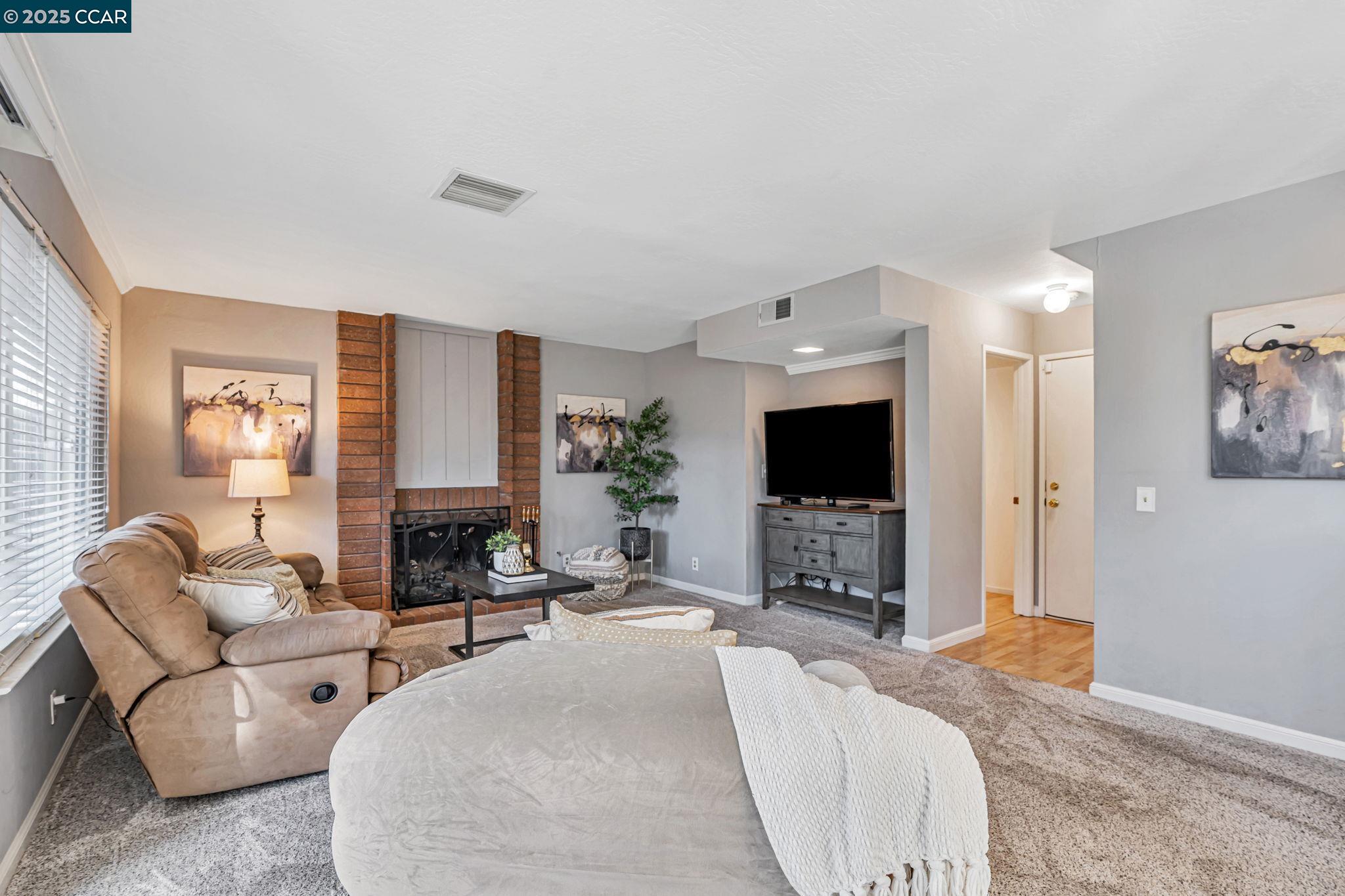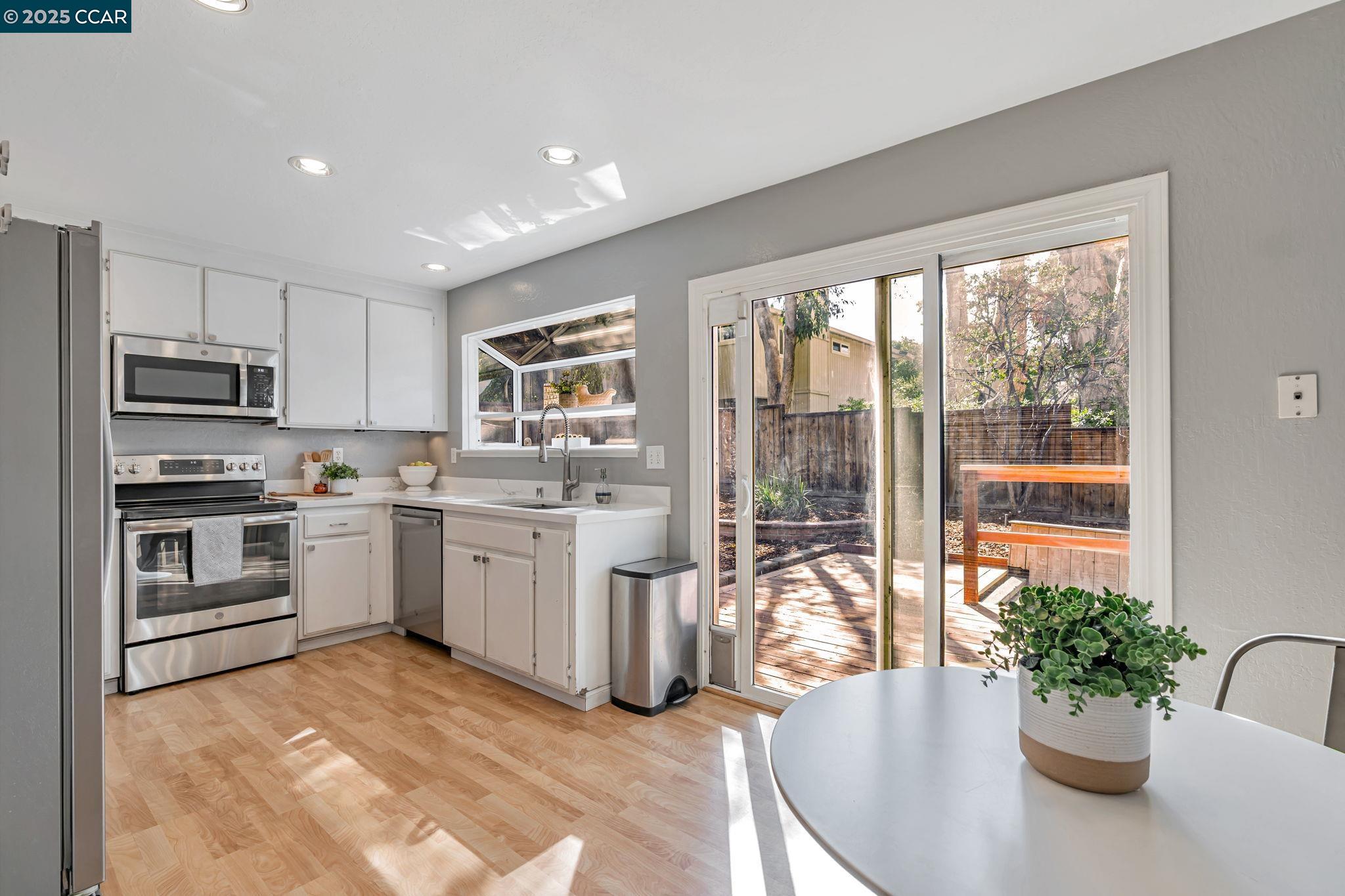 Welcome to your future home at the end of a charming cul-de-sac, nestled beside a tranquil Greenbelt in the Crossings. This spacious single-family home features 3 bedrooms and 2.5 baths, offering plenty of room for comfortable living. The living room and formal dining room boast stunning vaulted ceilings, creating an open and airy feel. The kitchen, complete with a nook, is perfect for casual meals, while the spacious family room offers a great space for relaxation by the cozy fireplace. The primary suite has vaulted ceilings, two closets and looks over the Greenbelt. This home is freshly updated with new carpets, custom plantation shutters, new Kitchen counter tops, newer appliances, and freshly painted exteriors and interiors, plus a brand-new driveway. Enjoy the benefits of a community with low HOA dues that grant you access to several pools, dog run, tennis and basketball courts, and a clubhouse. With convenient sidewalks you never have to worry when taking a stroll. This neighborhood feeds into the top-rated Walnut Creek Foothill Middle and Northgate High schools. Is close to BART and offers easy freeway access for commuters. This is a home that blends comfort, community, and convenience seamlessly.
