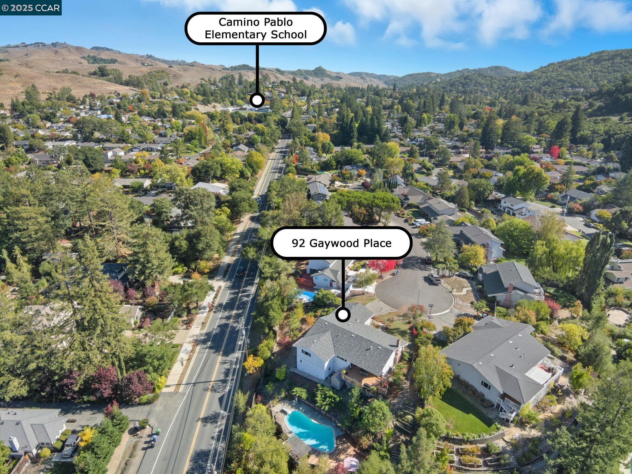 92 Gaywood Place is a charming single-level 4BR/2BA home (1,839 SF) on a tranquil cul-de-sac, set on a generous 0.44-acre lot -- the largest on the block. Enjoy beautiful hardwood floors, a bright living room with fireplace, and an open family/kitchen room leading to a spacious deck overlooking scenic Moraga valley views. The expansive private yard features a large pool deck for entertaining, plus mature fruit trees and room to garden or play. The property boasts a New Roof and is MOFD compliant. The primary suite offers a spectacular view and walk-in closet, with three additional well-sized bedrooms and ample storage. Laundry room conveniently located inside the home. A large walk-in pantry for ample storage needs. The separate downstairs room with bath (not in sqft) is ideal as an office, guest suite, or gym. The lot may also accommodate an ADU for added flexibility for extended family, guests or rental income. Ideally situated just minutes from top-rated Moraga schools, parks, country club - amazing trails for hiking, biking and exploration, this home blends comfort, convenience, and natural beauty. Short distance to top rated Elementary and Middle Schools. Enjoy Moraga's year round Farmers market.